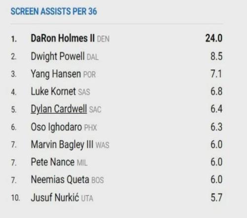 杨瀚森在本赛季NBA常规赛每36分钟内的掩护助攻次数,达到了7.1次,排在联盟第3 ,仅次于达龙·霍姆斯和德怀特·鲍威尔。
