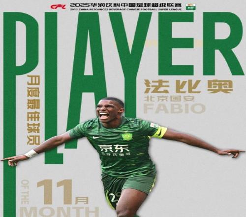 中超官方今日公布11月最佳球员,北京国安外援法比奥获得此荣誉。 11月的2场联赛,法比奥轰入6球送出1次助攻,并在末轮上演大四喜,成为本赛季的中超金靴。 注:11月评选范围为第29-30轮,共计2轮,参选球员数据以上述2轮比赛数据为准。